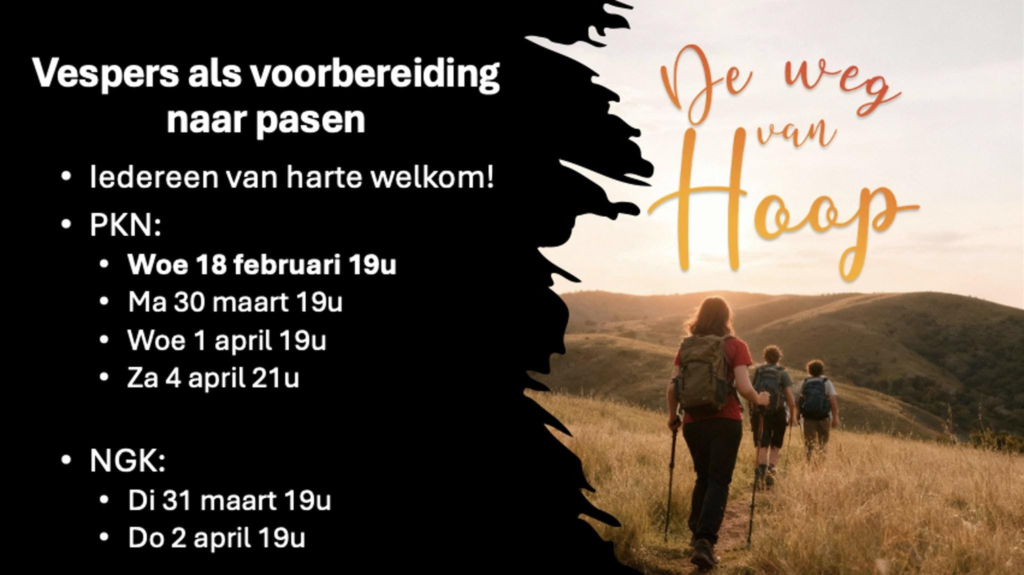 We houden Vespers in samenwerking met de PKN in Zaamslag. Samen willen we deze tijd van voorbereiding en stilte ingaan. Iedereen van harte welkom!